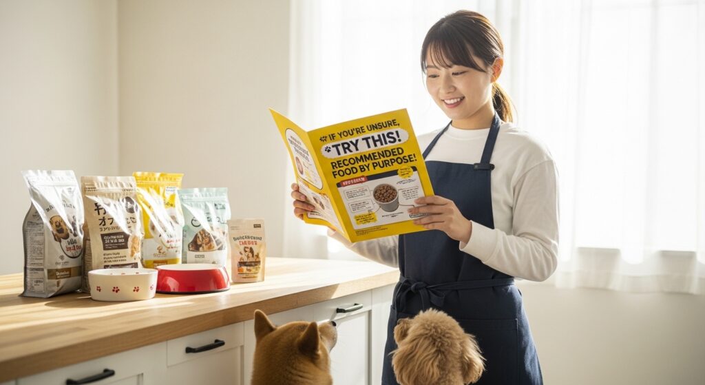 専門店や獣医師監修のガイドでは、ドッグフードの選び方として「①与える目的(総合栄養食・間食・療法食など)」「②年齢や体重・体調」「③原材料と添加物」「④カロリー・成分バランス」の4軸で考えることが推奨されています。たとえば「日々の健康維持が目的なら総合栄養食」「持病があれば療法食(獣医管理下)」「ダイエットなら低カロリー・高たんぱくの体重管理用フード」が基本です。