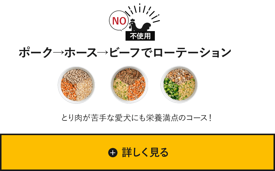 Bowlsでは牛・豚・鶏・魚・馬など異なるタンパク源に、さつまいも・小松菜・かぼちゃ・ブロッコリーなど旬の野菜や彩り豊かな素材を組み合わせた30種類以上のレシピを日替わりのように飽きずにローテーションできます。